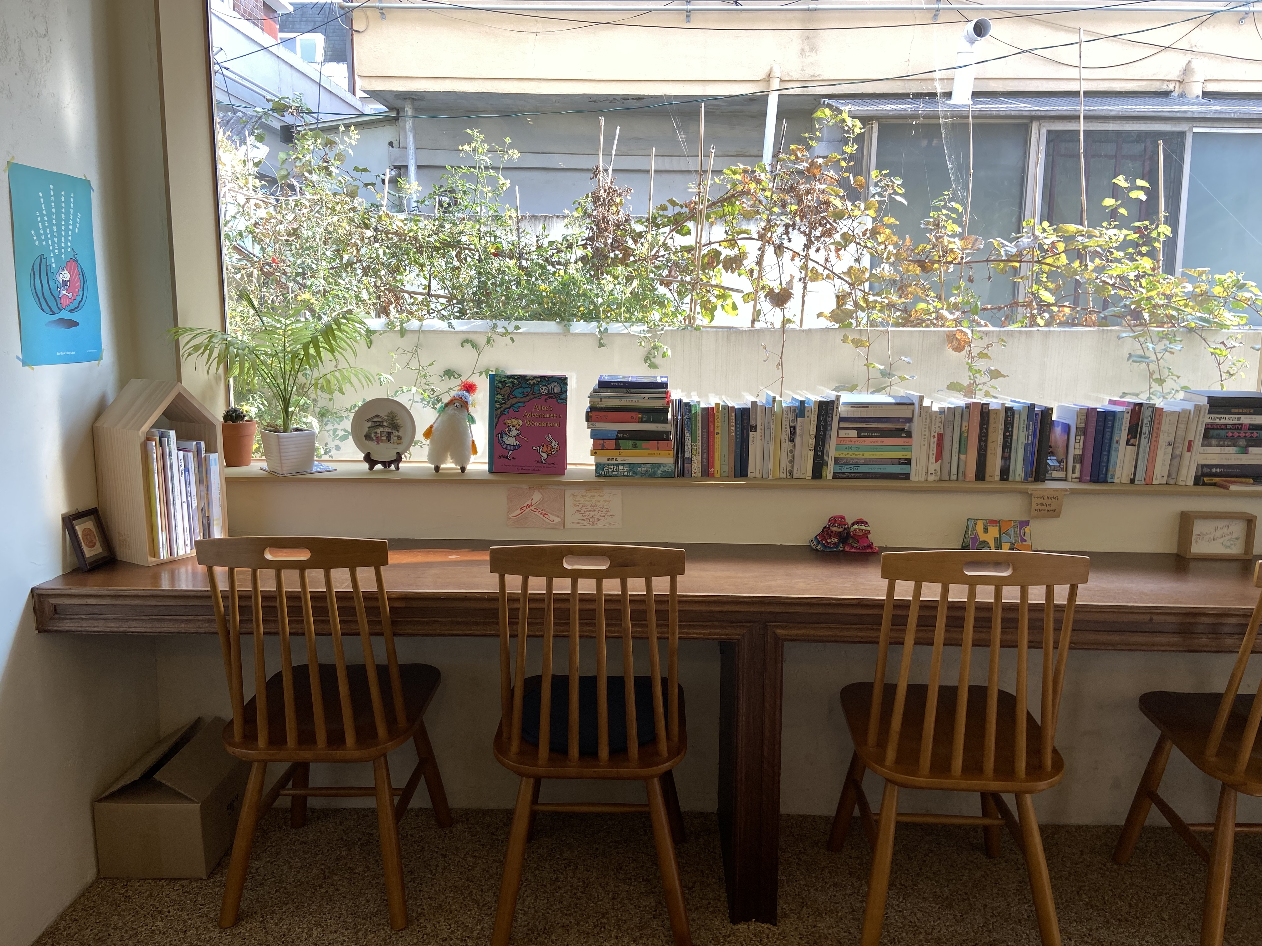 • 책방은 2층 주택 구조로 되어 있다. 1층은 책방과 카페가 운영되고 2층은 독서 모임 등 대여 공간으로 활용한다. 특히 햇살이 잘 드는 구조로 아기자기하고 아늑한 감성을 느낄 수 있는 공간이다.